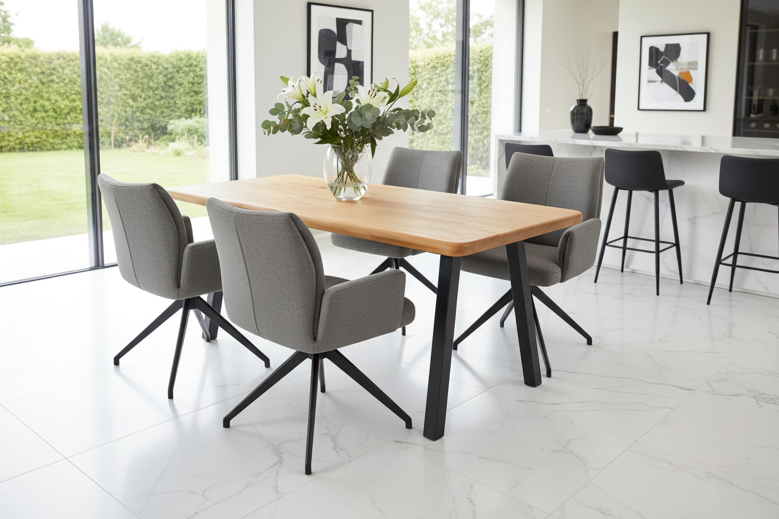 Akazienholz in Baumkanten-Optik und ein schwarzes Metallgestell formen eine Essgruppe im modernen Look, die deinem Zuhause Wärme und Charakter verleiht. Dazu passend vier Monti-Stühle mit drehbarer Sitzschale, softem Webstoff/Mikrofaserbezug und standfestem Metall-Vierfuß – für komfortables Sitzen zu jeder Gelegenheit.
