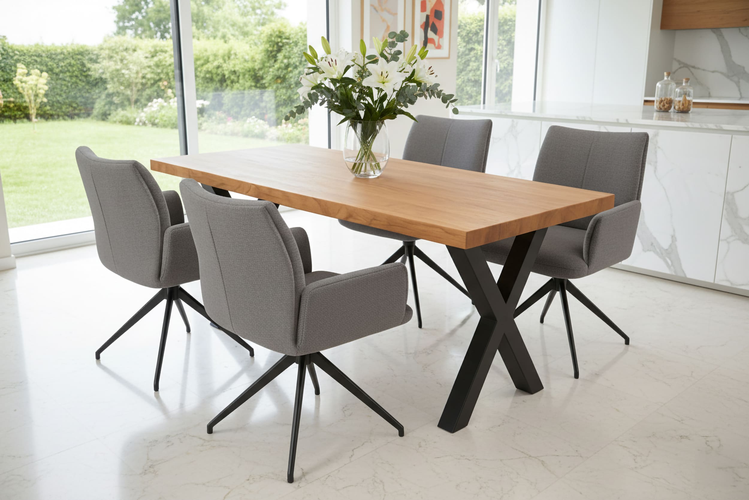 Akazienholz in Baumkanten-Optik und ein schwarzes Metallgestell formen eine Essgruppe im modernen Look, die deinem Zuhause Wärme und Charakter verleiht. Dazu passend vier Monti-Stühle mit drehbarer Sitzschale, softem Webstoff/Mikrofaserbezug und standfestem Metall-Vierfuß – für komfortables Sitzen zu jeder Gelegenheit.