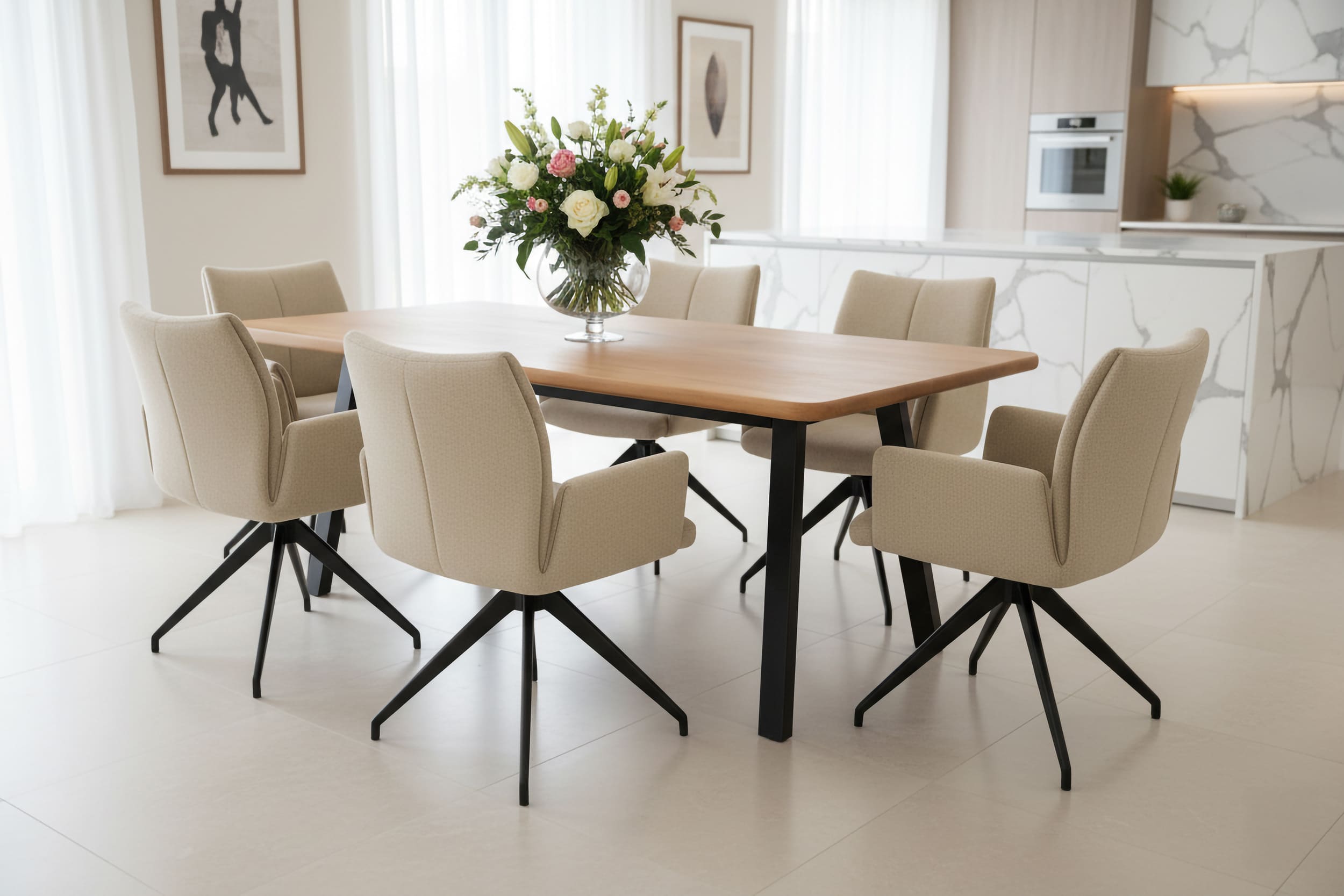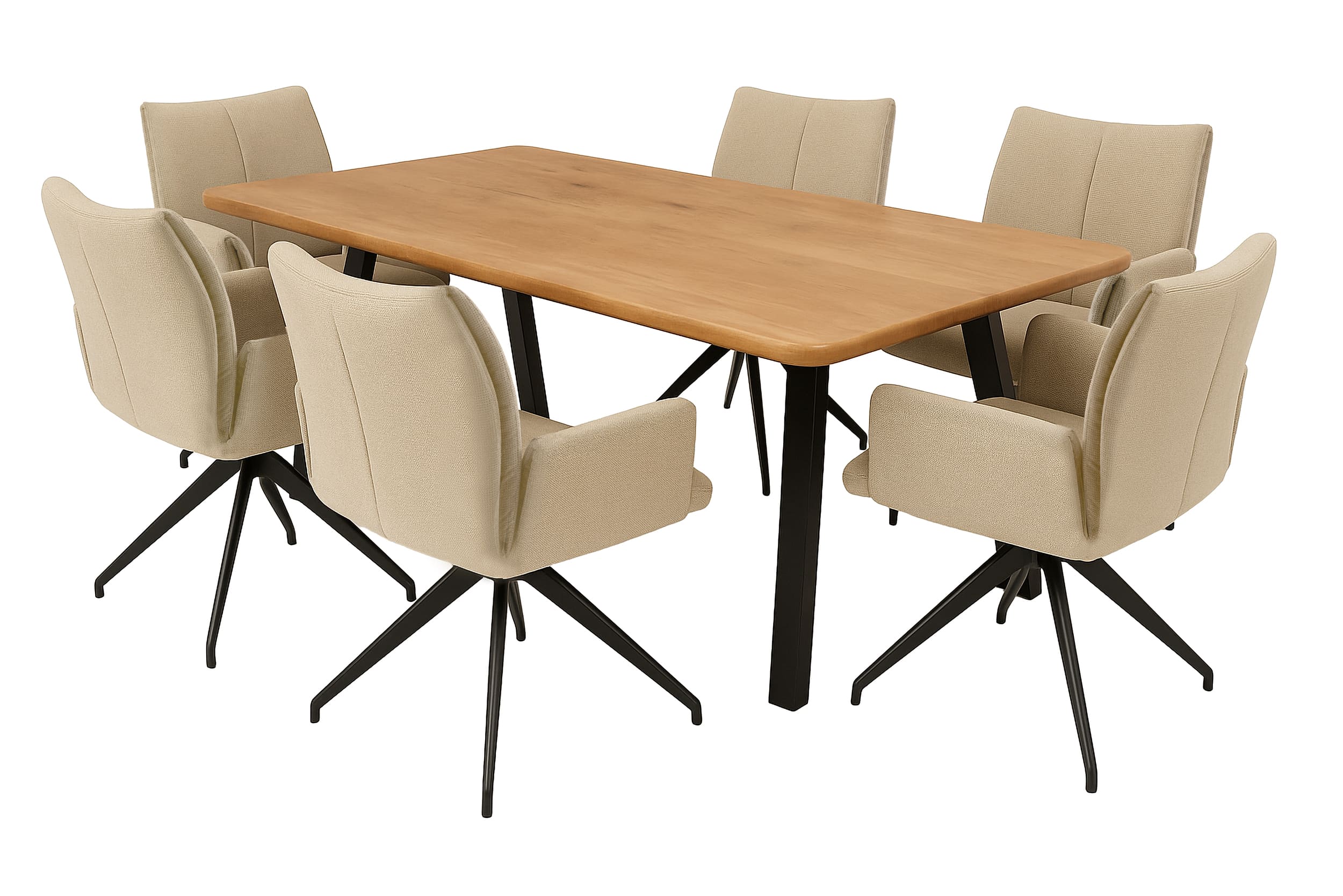 Akazienholz in Baumkanten-Optik und ein schwarzes Metallgestell formen eine Essgruppe im modernen Look, die deinem Zuhause Wärme und Charakter verleiht. Dazu passend vier Monti-Stühle mit drehbarer Sitzschale, softem Webstoff/Mikrofaserbezug und standfestem Metall-Vierfuß – für komfortables Sitzen zu jeder Gelegenheit.