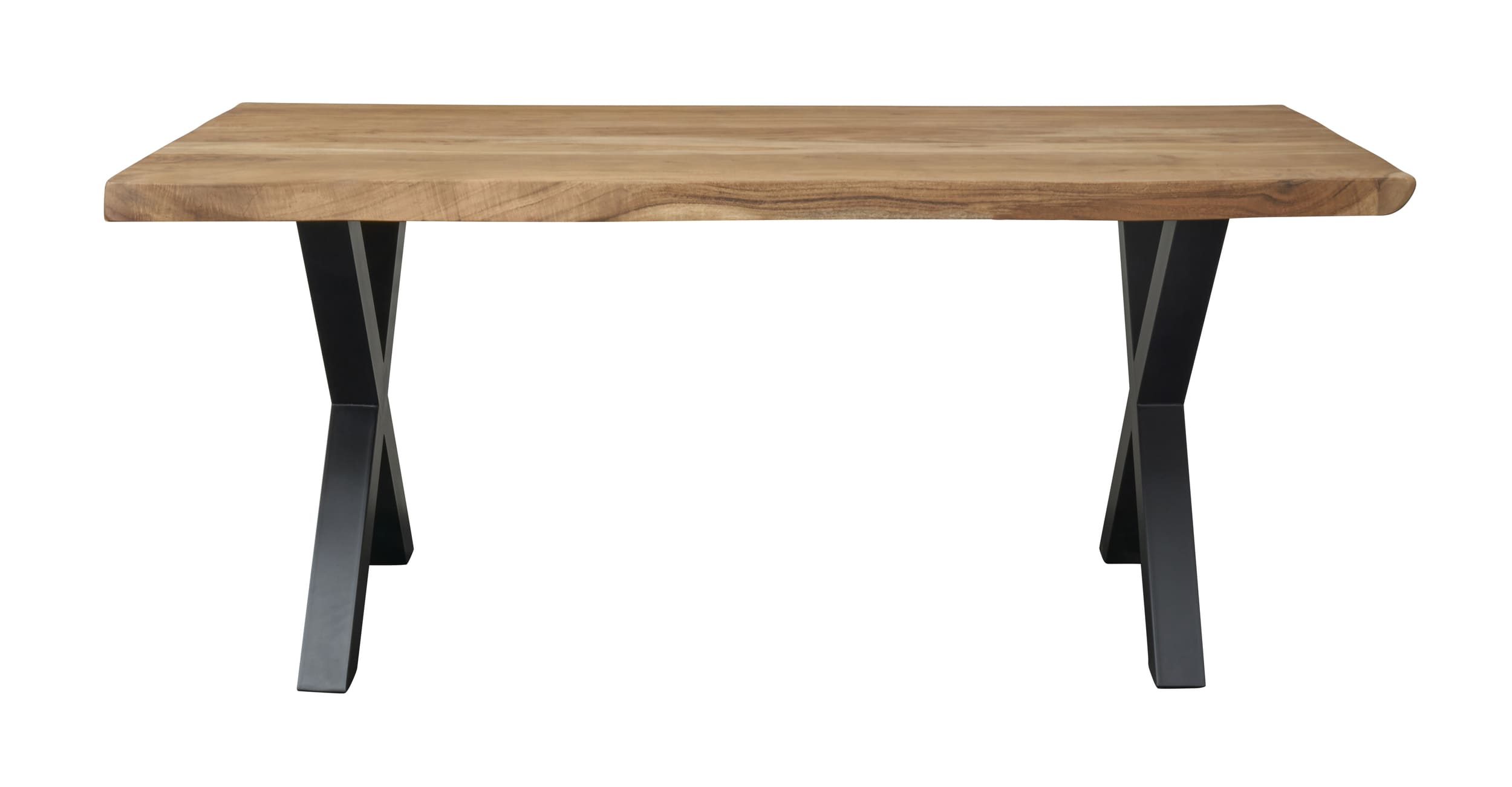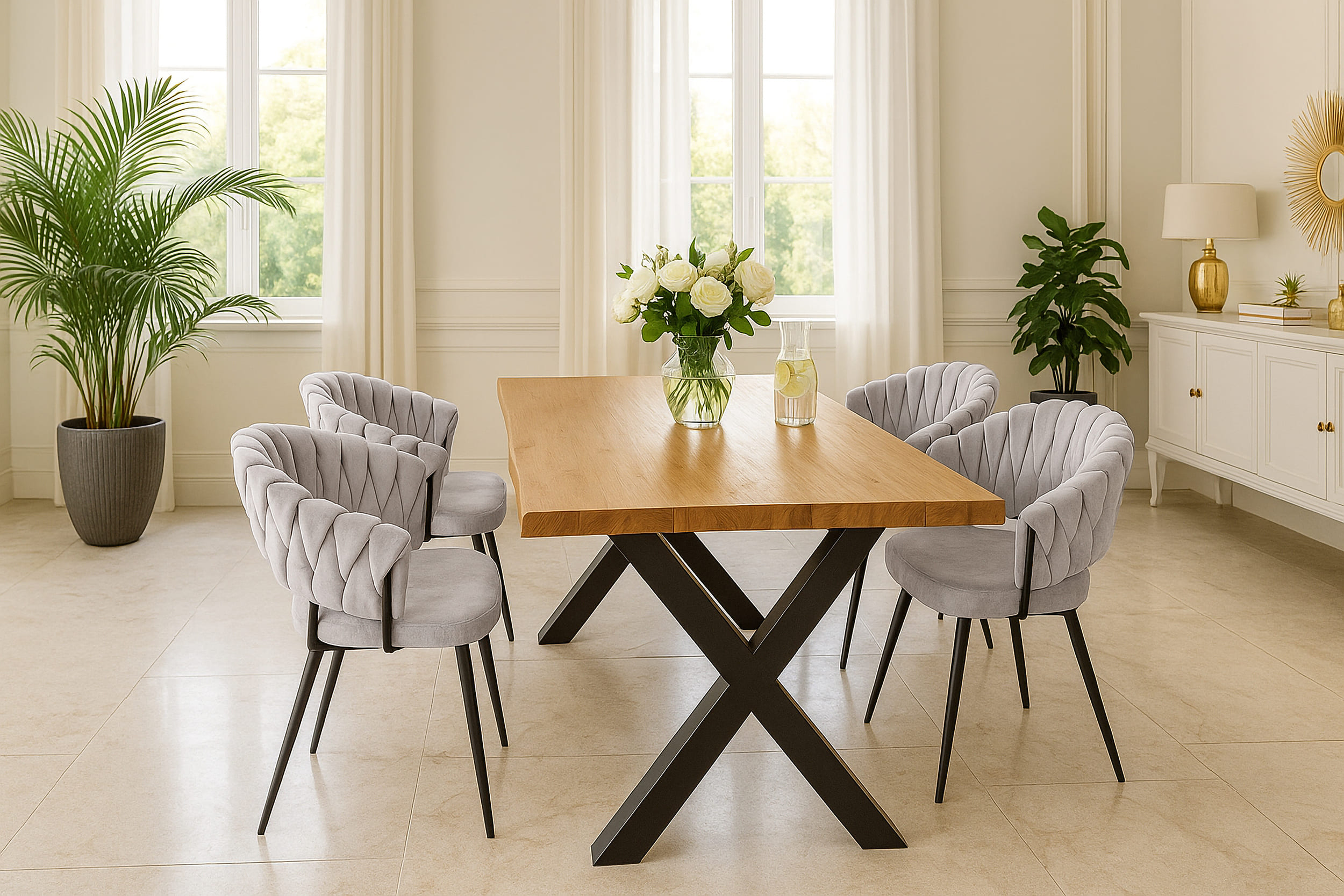 Die Essgruppe setzt einen ruhigen Akzent: Die Tischplatte aus Akazie mit Baumkanten-Optik zeigt eine natürliche Maserung, das schwarze Metallgestell bringt Klarheit in die Form. Dazu der Stuhl Remy – schlanke Silhouette, angenehm gepolsterte Sitz- und Rückenfläche, bezogen mit pflegeleichtem Stoff und getragen von einem Metall-Vierfuß. Das Ergebnis ist eine unaufdringliche Kombination, die Alltagstauglichkeit und wertige Materialität zusammenführt.