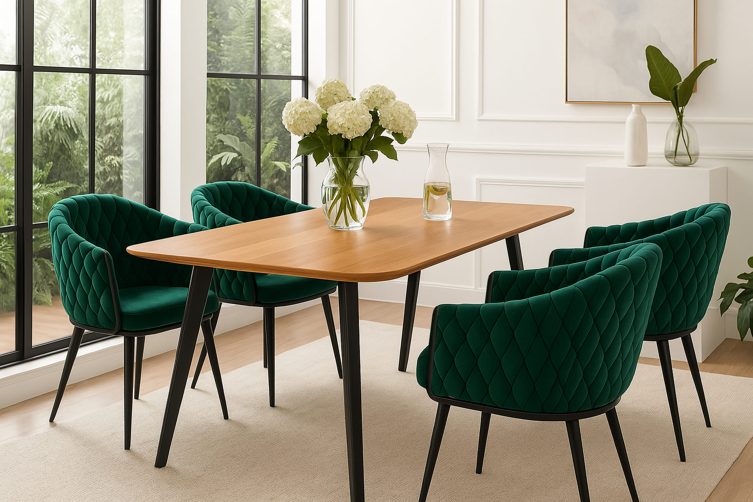 Die Essgruppe setzt einen ruhigen Akzent: Die Tischplatte aus Akazie mit Baumkanten-Optik zeigt eine natürliche Maserung, das schwarze Metallgestell bringt Klarheit in die Form. Dazu der Stuhl Remy – schlanke Silhouette, angenehm gepolsterte Sitz- und Rückenfläche, bezogen mit pflegeleichtem Stoff und getragen von einem Metall-Vierfuß. Das Ergebnis ist eine unaufdringliche Kombination, die Alltagstauglichkeit und wertige Materialität zusammenführt.