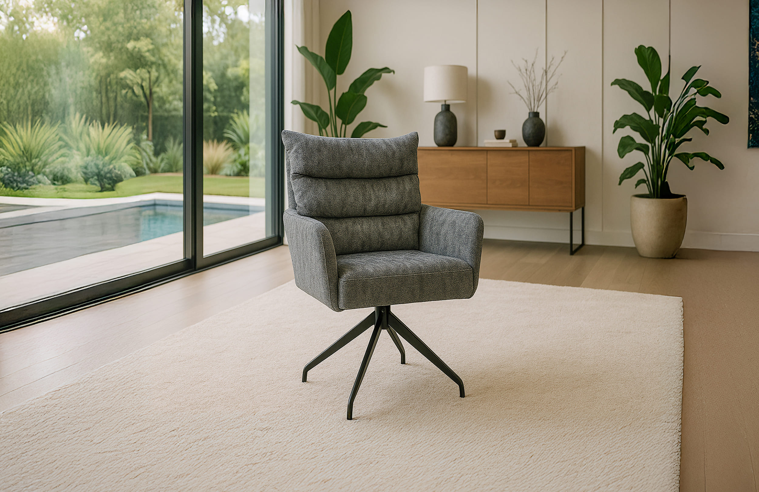 Der Esszimmerstuhl »Houston« von LC Home vereint modernes Design mit funktionalem Komfort – ein echtes Highlight für jedes Wohn- oder Esszimmer. Ob als bequemer Armlehnstuhl, stilvoller Loungesessel oder praktischer Drehstuhl – »Houston« passt sich flexibel deinem Alltag an. Dank seines hochwertigen Webstoffbezugs, der in drei geschmackvollen Farben erhältlich ist, lässt sich der Stuhl harmonisch in unterschiedliche Wohnstile integrieren – von skandinavisch über modern bis hin zu industriell. Die sanft gepolsterte Sitzfläche, die ergonomisch geformte Rückenlehne und die stabilen Armlehnen sorgen für ein angenehmes Sitzgefühl – auch bei langen Dinner-Abenden oder entspannten Stunden mit einem guten Buch.