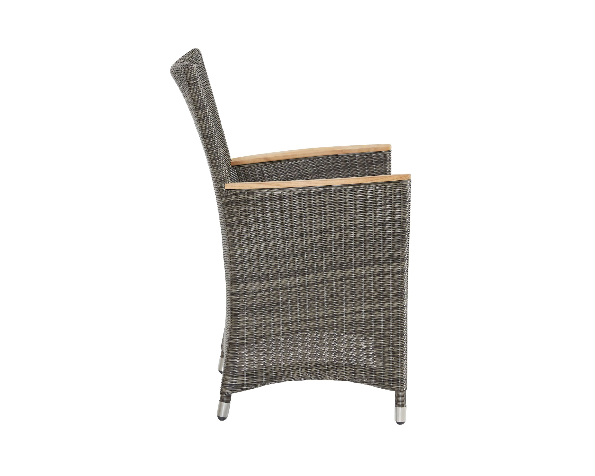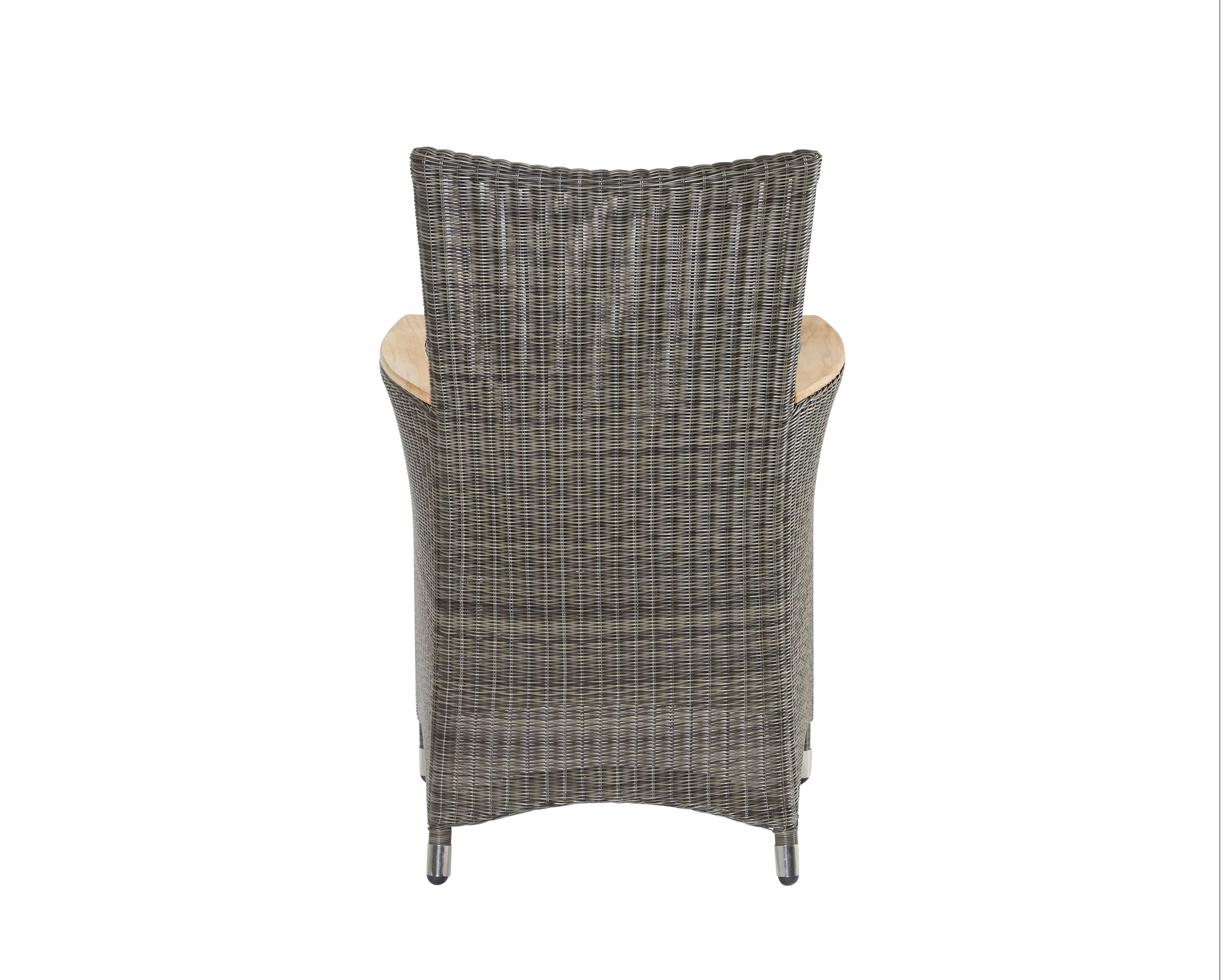 Dieses exclusive 8er Set Armlehnstuhl aus der Serie »Chelsea« in grauer Rattanoptik wertet Ihre Terrasse, Ihren Garten oder Balkon optisch auf, ohne sich allzu sehr in den Vordergrund zu drängen. Komfort, Eleganz und Design stehen hier in einem außergewöhnlichen Verhältnis. Die Gartenstühle bestehen aus hochwertigen creme-farbenen Polyrattanfasern und sind regenbeständig sowie UV-resistent. Die mitgelieferte, gepolsterte Auflage sorgt für bestmöglichen Komfort auch bei längerem Sitzen. Der Bezug der Schaumstoffpolsterung lässt sich dank des verdeckten Reißverschlusses leicht abnehmen und in der Waschmaschine reinigen. Ein Highlight ist die Armlehne aus nachhaltig hergestelltem Teakholz. Unsere Gartenmöbel sind handgeflochten. Sie erhalten somit individuelle Einzelstücke zum Preis von Serienmodellen.