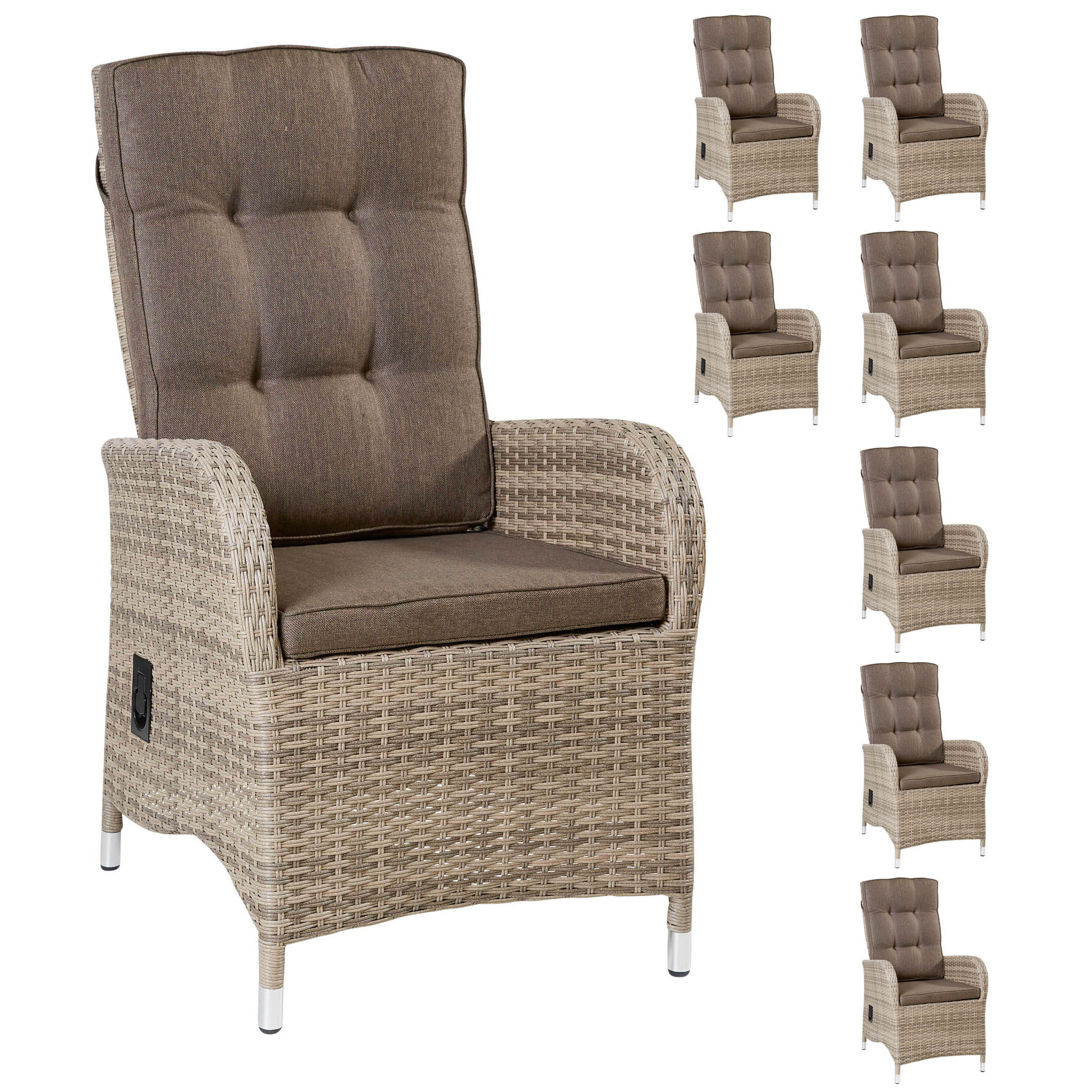 Dieser bequeme Positionsstuhl aus der attraktiven Möbelserie Turin wird Sie begeistern. Der mit Polyrattan-Geflecht bezogene Gartenstuhl aus Aluminium bietet, dank stufenlos verstellbarer Rückenlehne und großzügiger Sitzbreite, angenehmen Sitzkomfort ohne sich eingeengt zu fühlen. Der Sessel ist langlebig, unempfindlich gegen Rost und leicht. Der Hochlehner-Diningsessel wird mit der abgebildeten Sitzauflage geliefert.